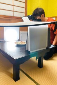 「櫓君2号」は、弊社が独自に名付けた機材です。軽量で持ち運びが簡単、組み立て式で形を自由に変えられる半透明のコンテナをディフューザーとして使用しています。ディフューザーとは、光を柔らかく拡散させ、食材の質感やディテールをより鮮明に引き立てるための道具です。